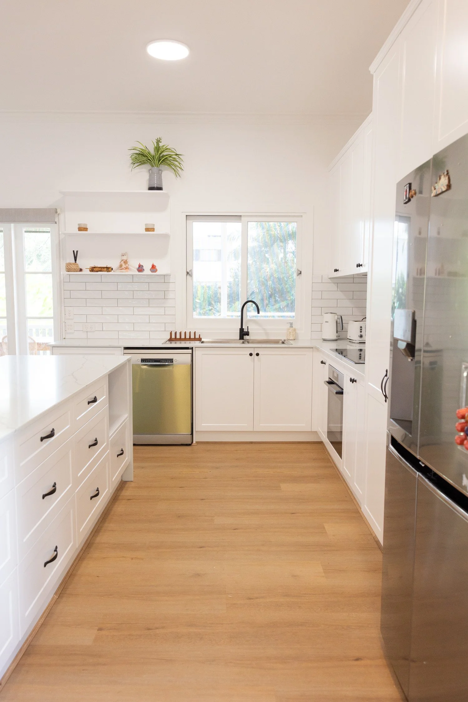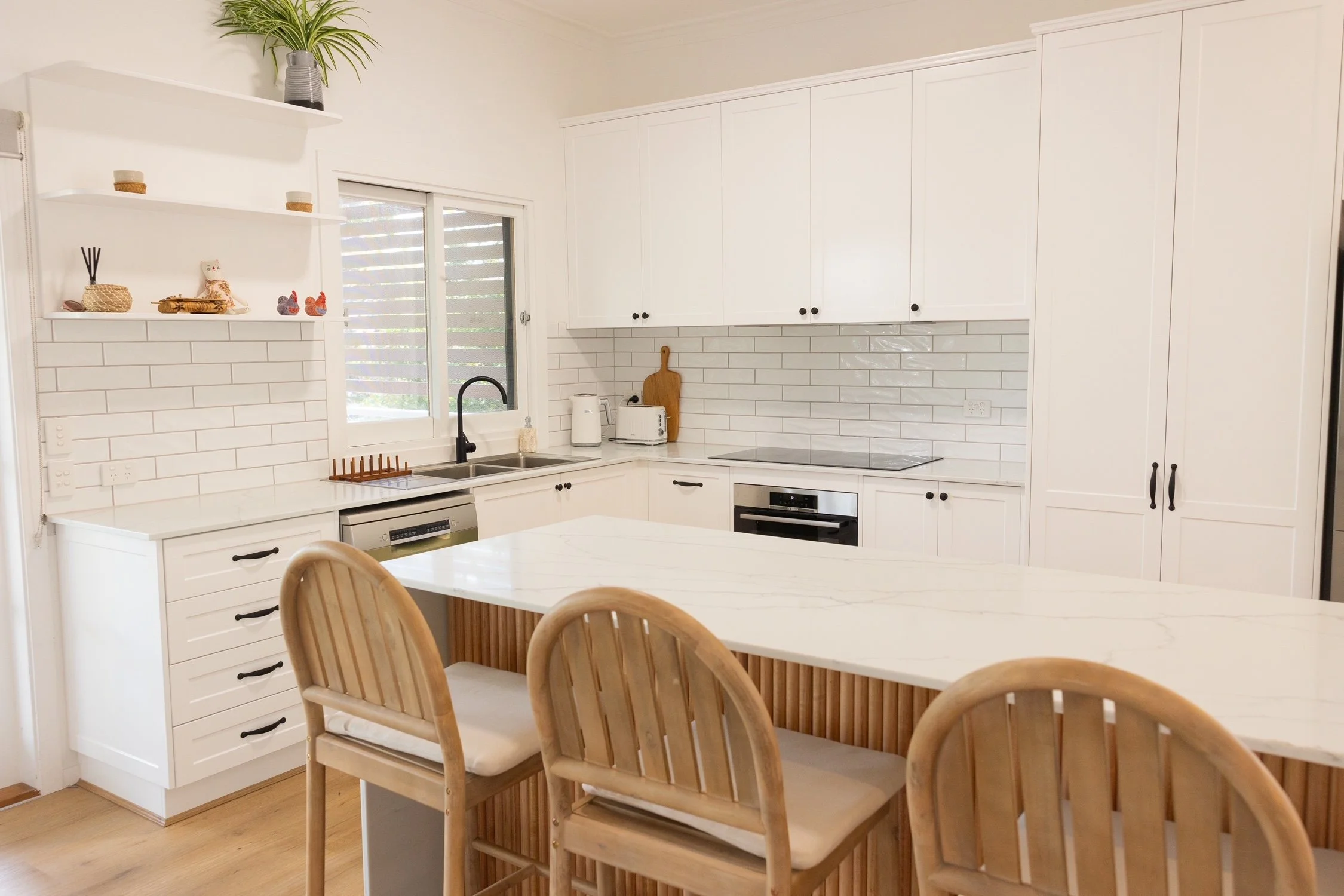 We began by removing the existing kitchen and opening the space by taking out the dividing wall between the kitchen and living area, making way for a generous island bench with breakfast bar seating. The new kitchen features classic 2-pac shaker cabinetry, stone benchtops with dual waterfall ends, soft-close drawers, and a combination of open shelving and clever storage solutions, including an internal-drawer pantry and pull-out bin.